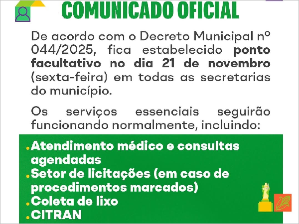 "DECRETA PONTO FACULTATIVO NAS REPARTIÇÕES PÚBLICAS MUNICIPAIS NO DIA 21 DE NOVEMBRO DE 2025 E ADOTA OUTRAS PROVIDÊNCIAS".